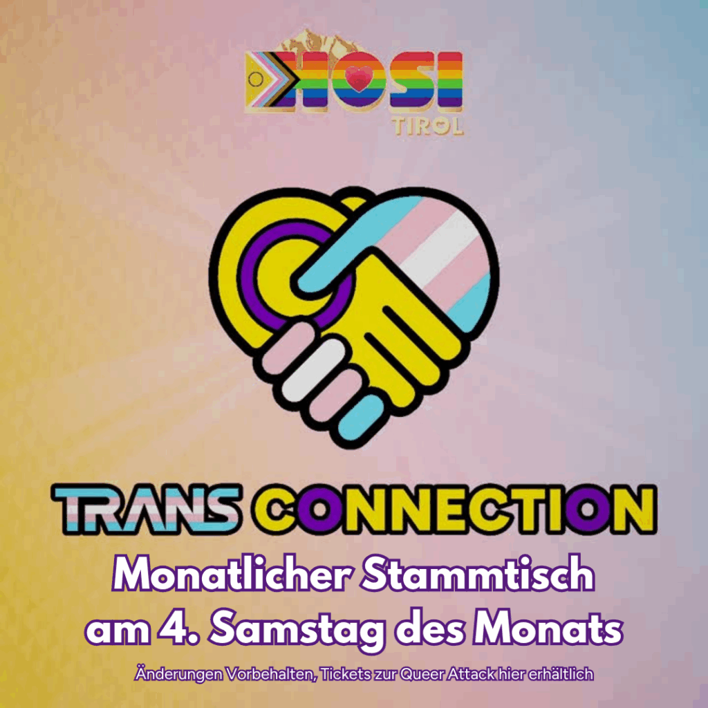 TransConnection ist der monatliche Treffpunkt der HOSI Tirol für trans, inter und nicht-binäre Menschen – ein sicherer Raum zum Austausch, Kennenlernen und gegenseitigen Unterstützen.